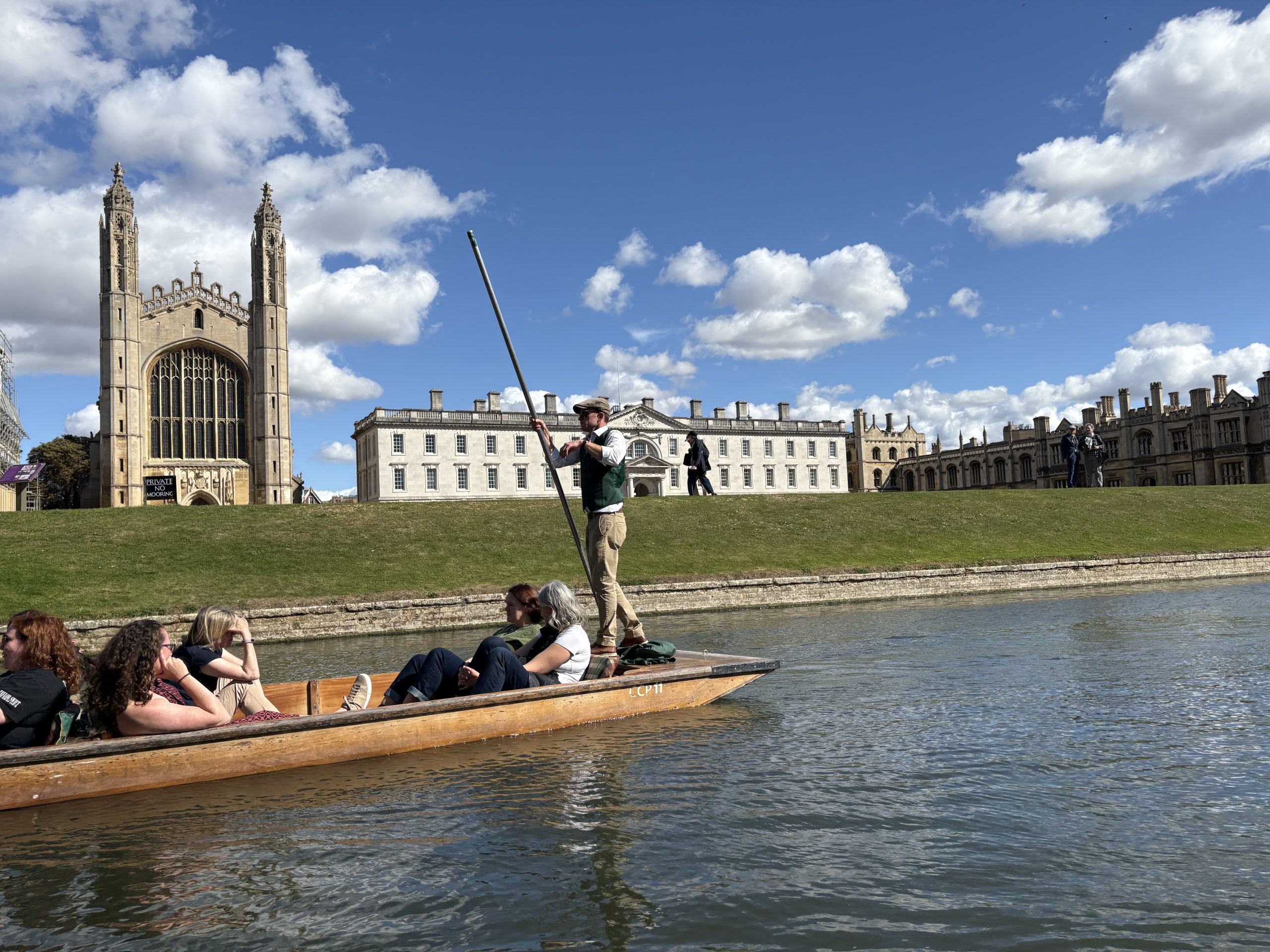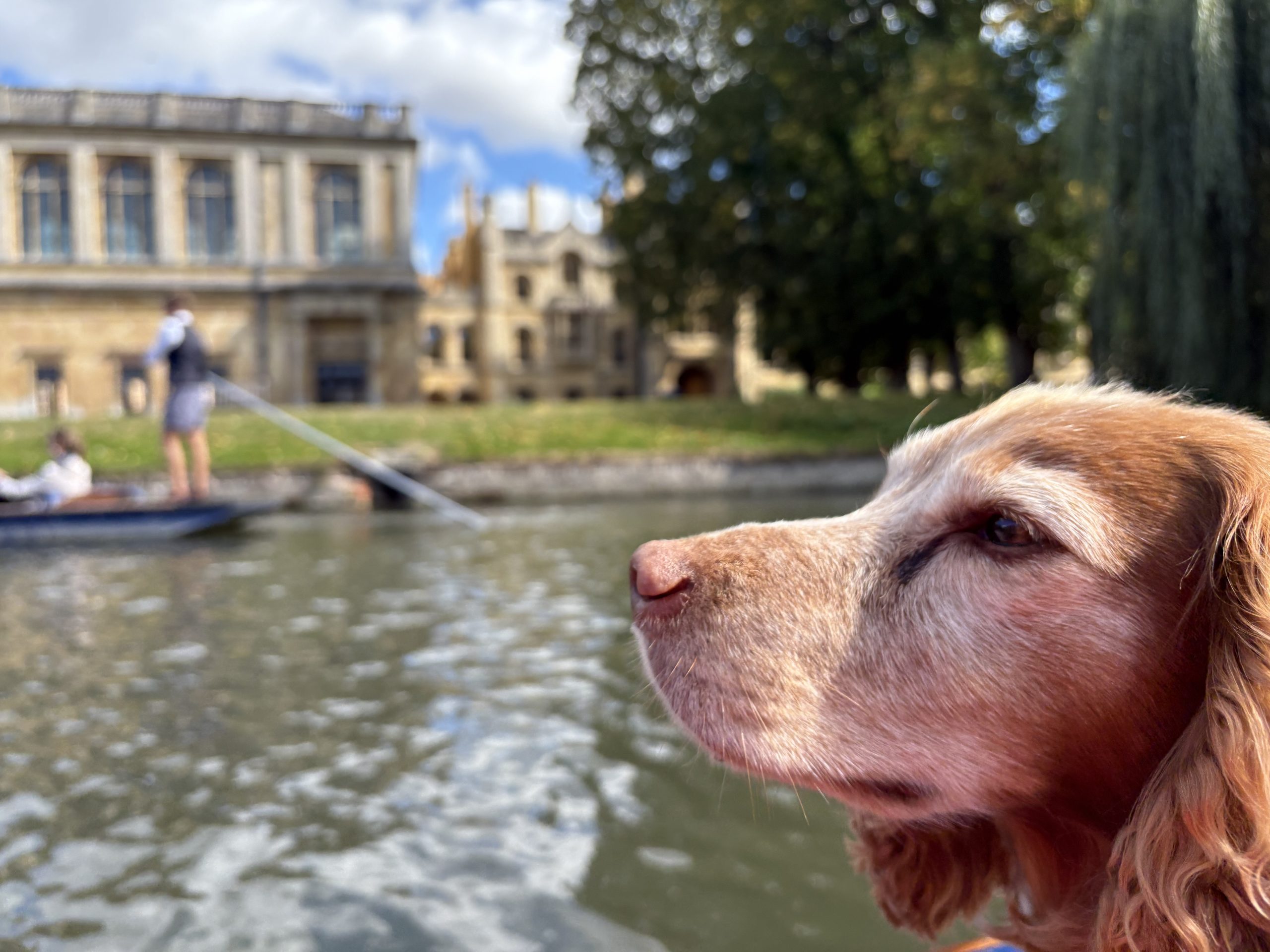 Next morning, after a hearty full English in the van, with a sausage each for the two girls, we made our leisurely way into Cambridge. The paved, tree-lined 2.5-mile footpath (creatively named The Footpath) led directly from The Plough straight into the city centre. Tash and Tilly aren’t big fans of traffic ,but the city centre is mostly pedestrianised, elsewhere traffic is light. The narrow streets in the historical sections means cars don’t travel down them anyway. In the centre, we started at the market square to take in some lovely artisan stalls. It isn’t a big market but it’s nice to have a look around and the girls enjoyed the smells. From there, we headed up to King’s College. It is one of the few colleges that accepts visitors but it is a paid entry and there are no dogs allowed. But it is worth a visit to view from the outside as the architecture is stunning. This was a great opportunity for us to take a break in one of the many dog friendly coffee shops facing King’s College. Tash and Tilly had a drink and a treat, while we humans may have also taken the opportunity for a coffee and a cake, just to be sociable. Once we had recharged, we had a wander around the quiet streets past the beautiful colleges. There are 31 in all so we didn’t see them all and none of them allowed dogs in the grounds, even the ones that allowed visitors. The famous Trinity College does allow visitors, but sadly no dogs again although wandering along the outside was beautiful. We crossed King’s College Bridge and skirted The Backs for the beautiful views before returning back to the Quayside to book a dog friendly punt. Sharing is the best value option (around £75 for two people and the dogs, depending on timing). It’s best to book in advance so that you are the first booking for the punt.